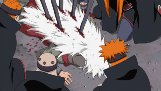 在成功击败三名佩恩后,自来也稍稍放松了戒备,却不料遭到佩恩的偷袭,瞬间身负重伤。就在这时,他终于见到了真正的“六道佩恩”。然而佩恩没有给他任何喘息的机会,立刻发动了新一轮攻击,最终将自来也打得奄奄一息。