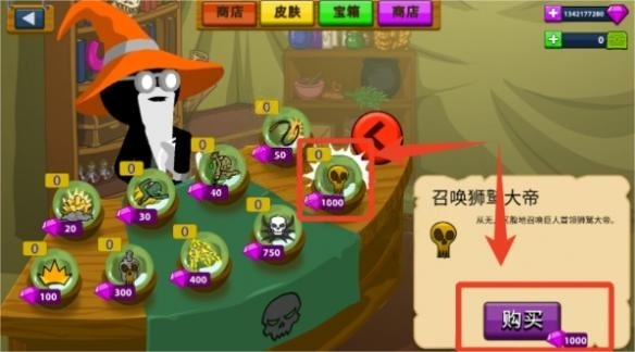 4、选择最右侧的黄色骷髅图案,这是能召唤狮鹫大帝的道具,需消耗1000钻石,点击进行购买。