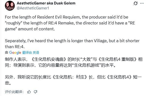 根据Dusk Golem在社交平台的说法,他听说这款游戏的流程时长会比《生化危机:村庄》更长一些,但又比《生化危机4》稍短。参考数据显示,《生化危机:村庄》的通关时间大约是10小时,《生化危机4》的平均通关时长则在16小时左右。
