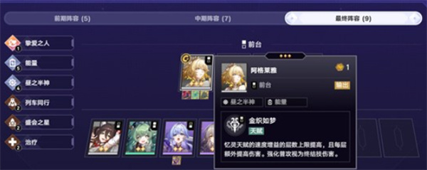 核心以阿格莱雅为中心,借助堆叠速度属性实现速度向伤害的转化,从而构建持续的压制效果。