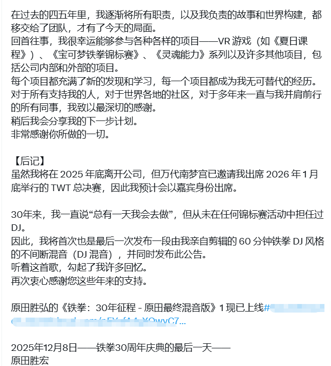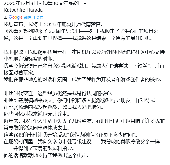 《铁拳》系列的创意总监原田胜弘,通过个人社交动态对外宣布,自己计划在今年年底正式离开万代南梦宫。他同时提到,恰逢《铁拳》系列迎来30周年纪念,这正是为自己这段职业生涯画上句号的理想节点。