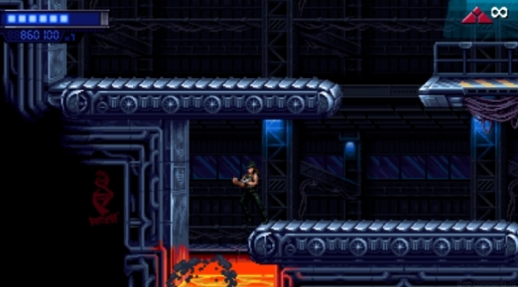 继续往前走,直到你看到一个传送带区域,它的下方有火焰喷射出来。