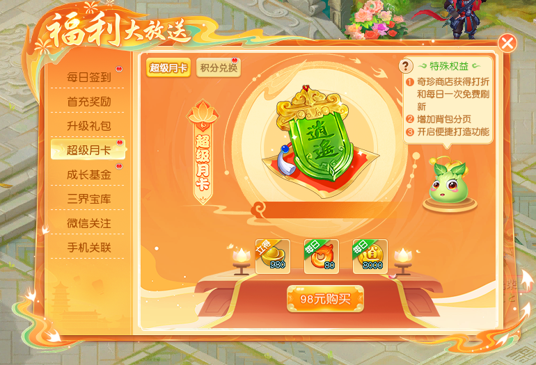 要是你开通了福利里的超级月卡,奇珍商店就会把你当作贵宾:店里所有商品都能享受9折优惠,而且每天还能额外得到一次免费刷新的机会。如果你经常光顾这里,开通超级月卡绝对是很划算的选择。