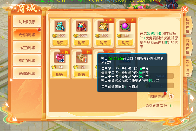 奇珍商店的商品不是固定不变的,每天凌晨0点都会自动更新一批货品。要是对当前展示的商品不满意,还能手动进行刷新操作。每天的第一次刷新是免费的,之后每刷新一次都需要消耗元宝,而且随着刷新次数的增加,每次刷新所需消耗的元宝数量也会相应提高。