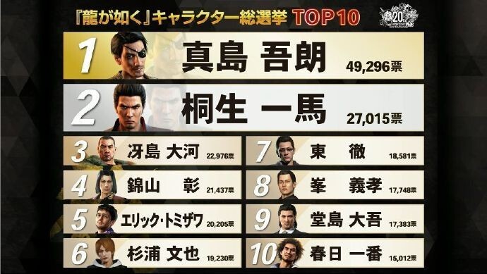 根据投票结果,此次投票的总票数达到490278票,覆盖了全球112个国家和地区。在人气角色评选中,被国内玩家亲切称为“麻吉麻桑”的真岛吾朗以49296票的成绩位居榜首。紧随其后的是第二名“气流酱”桐生一马(27015票)和第三名冴岛大河(22976票)。