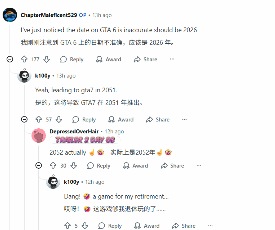 玩家们甚至在评论区指出图片日期存在不准确之处,《GTA6》预计2026年推出,照此推算《GTA7》可能要等到2052年了。