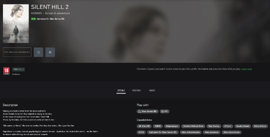 据Trueachievements消息,通过微软应用商店的游戏页面信息显示,《寂静岭2:重制版》会同步登陆Xbox Series X|S主机和PC平台,不过令人疑惑的是,页面列表里没有标注对“Xbox Play Anywhere”(Xbox随处玩)功能的支持。尽管商店页面未清晰写明发售日期,但Trueachievements从后台数据中核实到,这款重制版游戏计划在2025年11月21日正式推出。