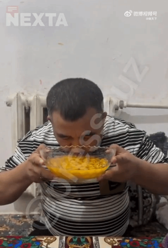 视频里,男人拿起面前放着的一盆生鸡蛋,一口气就喝了下去,脸上看不出丝毫难受的样子,显然是早就驾轻就熟了。