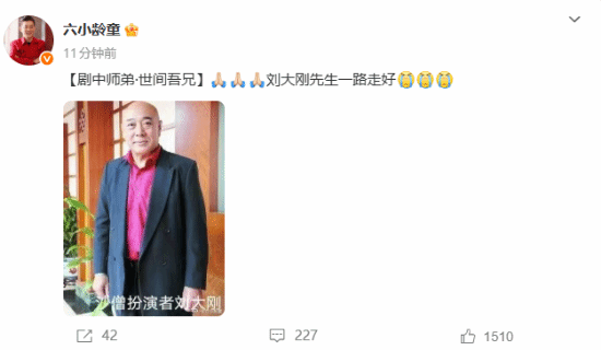 今日,六小龄童发文悼念刘大刚,写道:“剧中是师弟,世间为吾兄。刘大刚先生一路走好。”据悉,二人曾合作拍摄《西游记续集》。