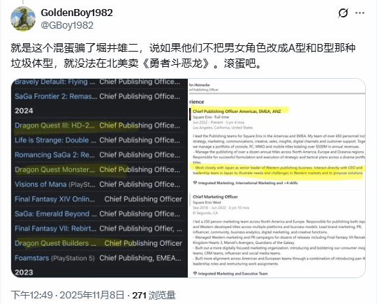 同时,这位“觉醒”文化的拥护者还曾对那些担忧“觉醒”文化会影响SE旗下游戏的玩家说出“快点滚”之类的话,除此之外,他还多次发表不当言论。更有粉丝爆料,《DQ》里被加入的“觉醒”文化相关内容,正是他的手笔。