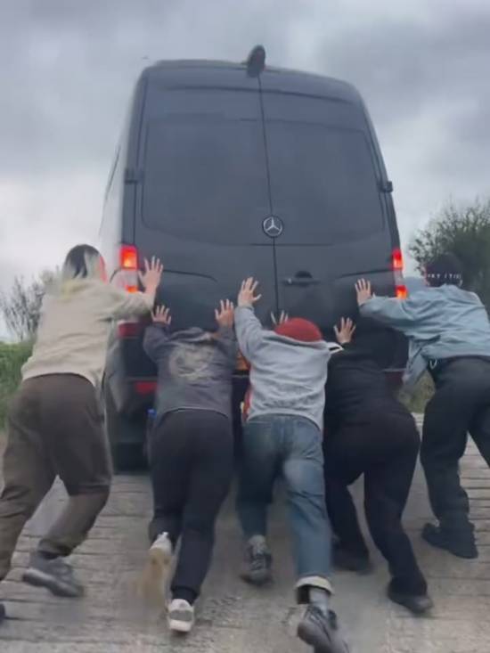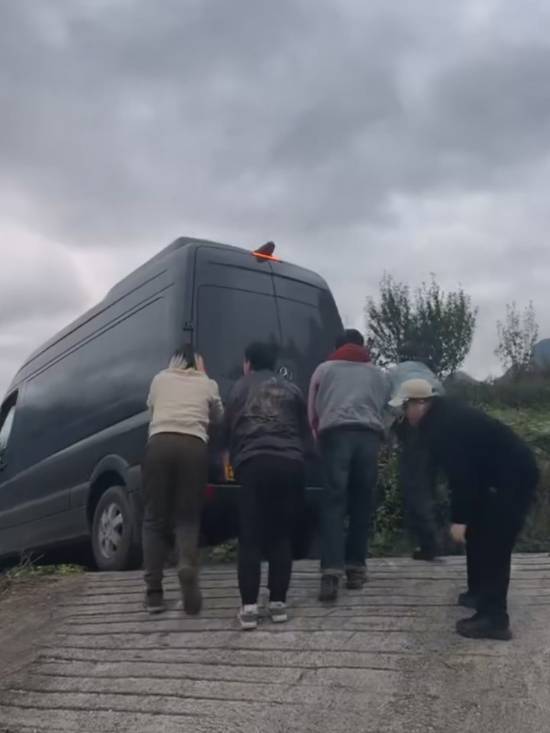 杨奇发布的视频里,五位同行人员一起用力推车,成功把车子从下坡处推上了坡道。从画面判断,这辆车看起来像是奔驰的高端商务车型斯宾特。