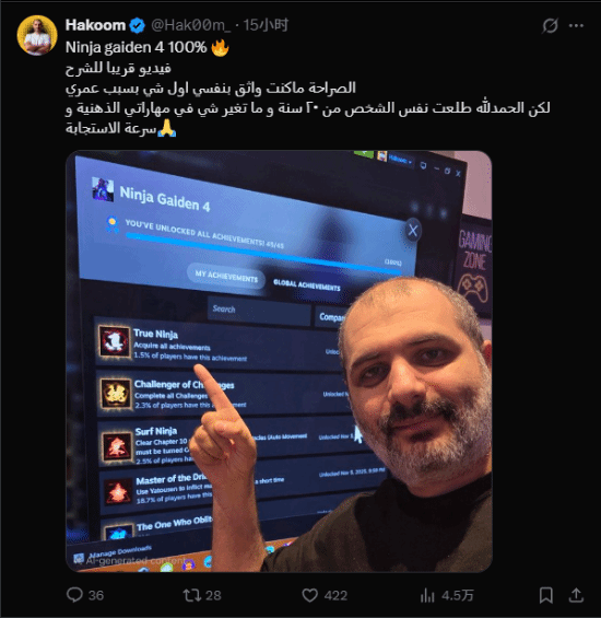 近日,Hakoom在PC平台上再次展现出令人惊叹的实力。他顺利完成了高难度游戏《忍者龙剑传4》的全成就挑战,并通过社交平台分享了Steam截图,正式宣告自己达成该游戏100%通关的成就。