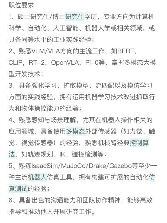 职位要求应聘者具备硕士或博士学历,专业需为计算机科学、自动化、人工智能等相关领域,拥有5年及以上机器人算法或AI研发工作经验,熟练掌握VLA(视觉-语言-动作)模型、强化学习或机器人控制理论。