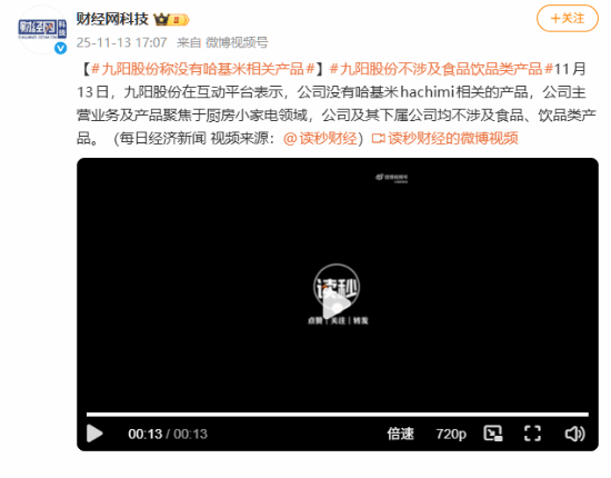 不过据微博账号@财经网科技今日消息,九阳股份在互动平台回应称,公司目前并无哈基米hachimi相关产品,主营业务及产品始终聚焦厨房小家电领域,公司自身及下属所有公司均未涉及食品、饮品类产品业务。