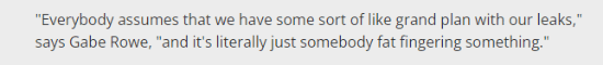 另一位工程师Gabe Rowe补充说:“大家常常觉得我们这边信息泄露背后藏着什么周密的大计划,可事实是——真的就只是有人不小心操作失误了而已。”