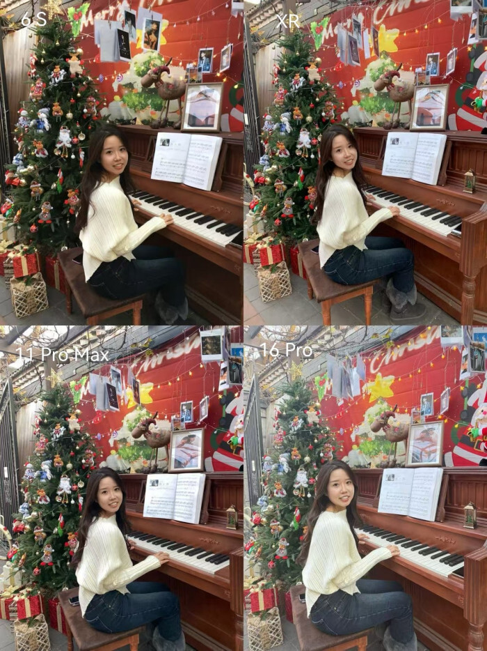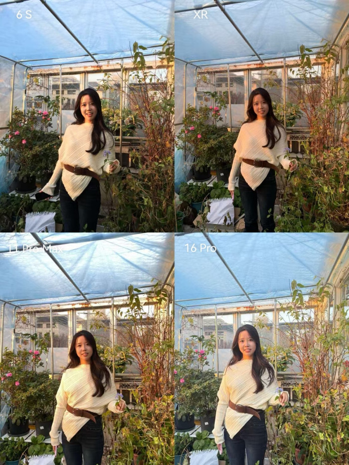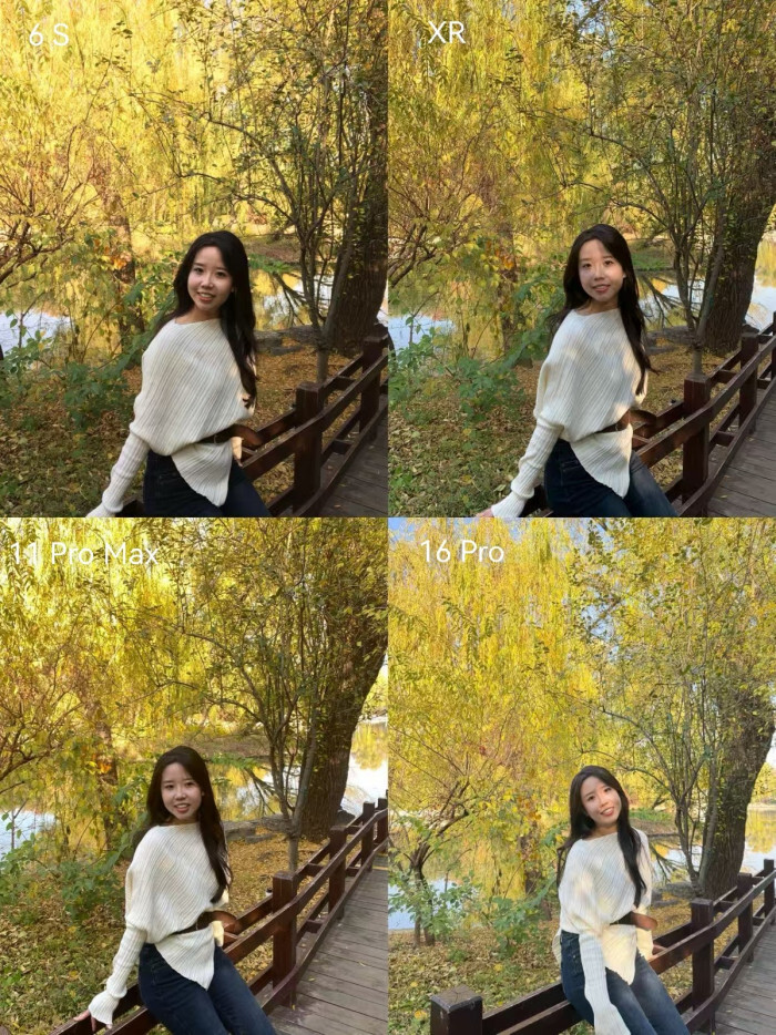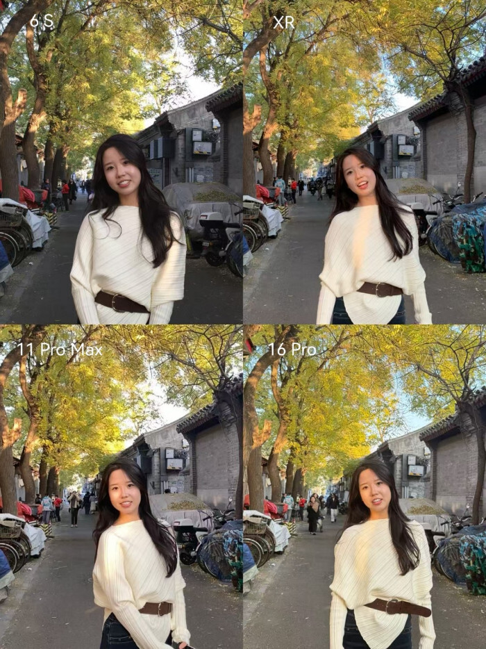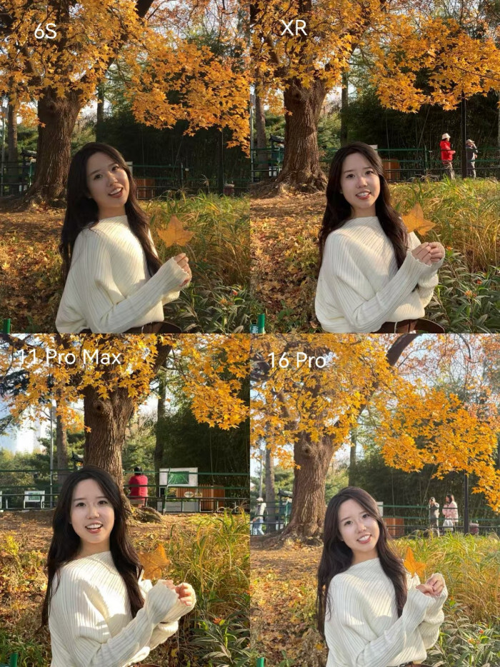 我们来看第二组,这组照片采用侧逆光拍摄,背景是秋叶。在这组测试中,四款手机的表现都很稳定,并且各具特色。如果想要营造出氛围感和电影质感,6S会是合适的选择;要是偏好自然的成像效果,XR或11 Pro Max会更符合需求;而追求皮肤白皙、带有“自动美颜”效果的话,16 Pro则能满足。毕竟每个人的审美标准不同,具体如何选择,还是要看个人的偏好。