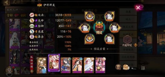 伊邪那美 推荐速度、攻击/暴击属性,命中方面需注意(优先作用于全队生命值最低的单位,五号位佩戴未升级的御魂)
