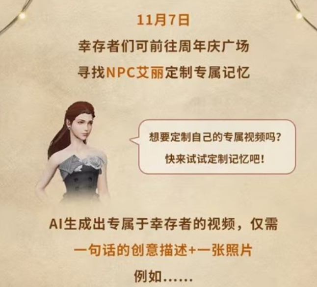 《明日之后》七周年庆典即将开启,官方宣布将于11月7日上线全新玩法“AI定制专属记忆”。这项创新功能将为玩家带来全新体验,下面是小编为大家整理的详细资讯,感兴趣的玩家可以来了解一下!