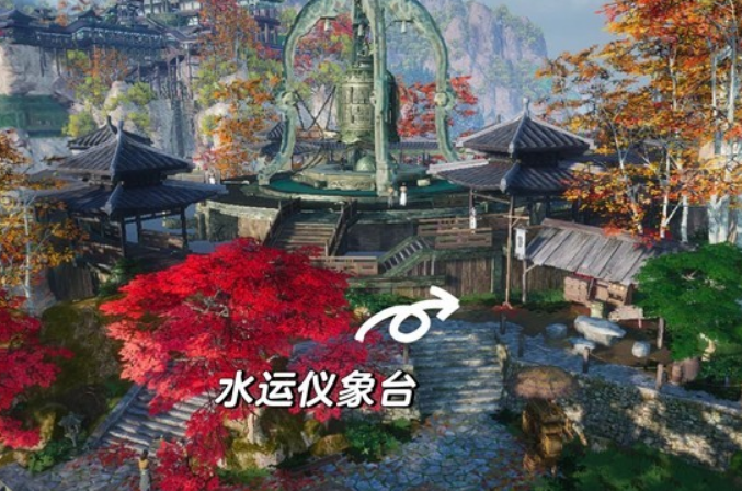 水运仪象台的位置,就在百悬桥界碑那里,穿过右手边的廊亭往下走就能到,这儿的景致浑然天成。不过我这边任务还没完成,加上碧水云涛的点位也没开启,所以就只是简单摆放了一下,还没来得及装修。