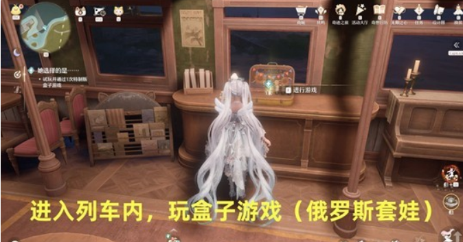 进入列车车厢后,找到那个特制版本的盒子游戏,点击它就能开始游玩;这个游戏其实就是俄罗斯套娃游戏,玩法是猜测一个橙色套娃所在的位置。