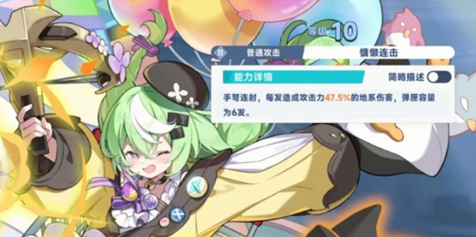 小禾的普通攻击包含六段,每轮能连续发射六支箭矢,攻击节奏顺畅不过没有额外附加效果。当最后一发箭矢射出后,会进入短暂的换弹阶段,这期间没办法马上衔接下一轮普攻。这个机制让她在作为主控输出时,缺少持续的压制力和功能性,更多是充当基础伤害的补充角色。尽管攻击手感还不错,但整体输出能力在同类型的主控角色里并不出众,所以不建议把她当作核心输出位长期培养使用。