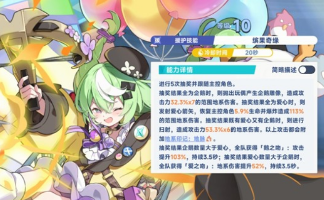 当小禾担任援助角色时,她的技能作用会显著增强。使用援助技后,她会随机扔出企鹅或爱心道具,不同的组合会产生不同的效果:如果全是企鹅,就会触发七次地系范围伤害;要是全是爱心,就会给主控角色恢复生命值,同时造成一次范围爆炸;如果两者都有,就会对敌人进行扫射。更关键的是,当企鹅数量比爱心多时,全队的攻击力会得到提升;反过来,全队的地系伤害就会增加。不管最终是什么结果,这个技能一定会给敌人加上地系印记,大大提高了队伍后续引爆技能的覆盖范围。