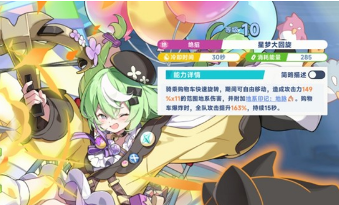 小禾的绝招启动后,她会操控购物车在场内高速旋转移动,持续对范围内敌人造成地系伤害,同时给所有被命中的目标附上地系印记。技能结束时购物车会发生爆炸,并且为全队提供攻击力增益,持续时间有15秒之久。因为这个增益覆盖范围大且持续时间长,所以特别适合在对抗高血量BOSS类敌人时释放,保证队友能完整享受到加成效果。搭配印记机制,还能为队伍里的地系爆发角色创造出极好的输出时机。