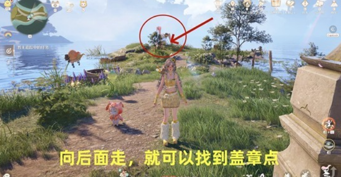 先传送到涟漪之窖旁边的锚点,接着朝前方望去,就能找到盖章的位置了。