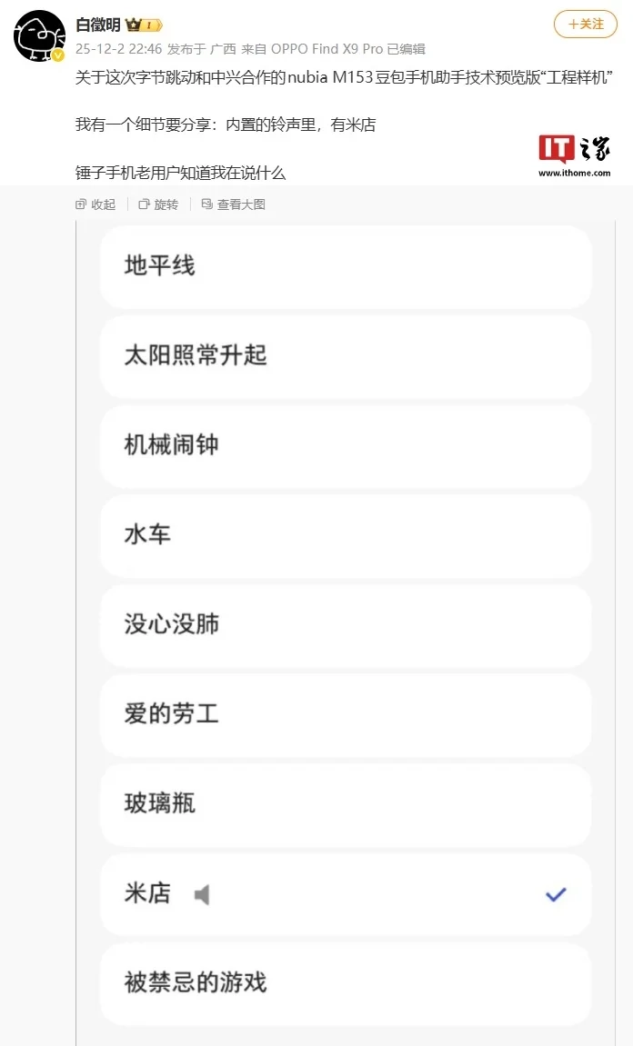 另外,博主 @白徵明 还发现,该机内置的铃声里有“米店”(IT之家注:铃声“米店”是锤子手机的内置手机铃声之一)。