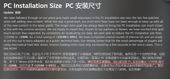 经过多轮测试优化,PC版游戏的安装体积得到了大幅压缩,从原先152GB的庞大容量精简至约23GB的轻量化大小,显著降低了新老玩家入坑或回归时的硬盘空间门槛与存储负担,这一优化也收获了众多玩家的好评。