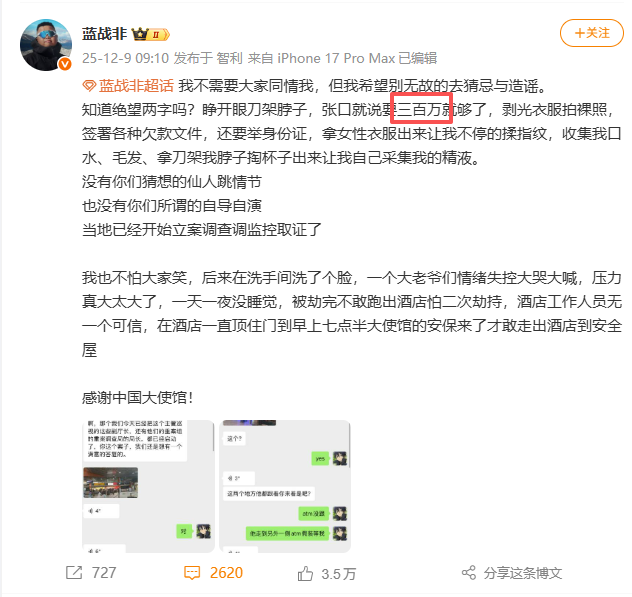蓝战非炫富的行为确实欠妥,但这难道能成为他被绑架的理由吗?就好比有人穿着光鲜却遭遇骚扰,难道要去责怪受害者吗?况且他早就明确回应过:我不需要大家的同情,只是希望别再无端猜忌和造谣,同时还透露当地警方已经立案,并调取监控进行取证了。