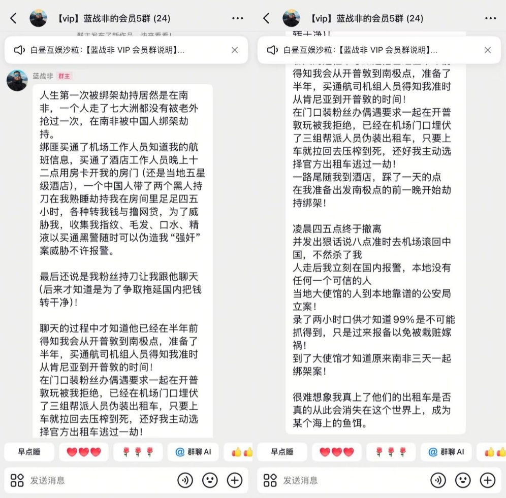 根据他在粉丝群里分享的内容以及最新回应来看,这件事听起来比电影情节还要惊险刺激:绑匪早在半年前就开始策划布局,清楚他要从开普敦前往南极,不仅买通机场地勤获取了航班信息,还收买了五星级酒店员工拿到房卡,在半夜十二点直接开门闯入房间。