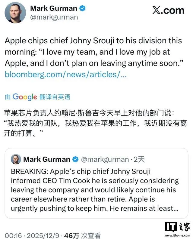 12月9日消息,彭博社获得的一份内部备忘录显示,苹果芯片业务负责人约翰尼・斯鲁吉(Johny Srouji)亲自澄清,他并没有离开苹果公司的计划,并且已明确表示会继续留在公司。