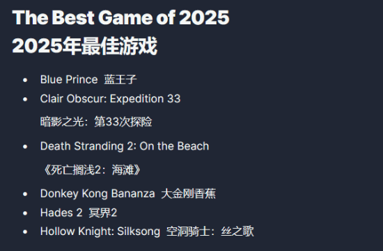 《蓝途王子》《光与影:33号远征队》《死亡搁浅2:冥滩之上》《咚奇刚:蕉力全开》《哈迪斯2》《空洞骑士:丝之歌》