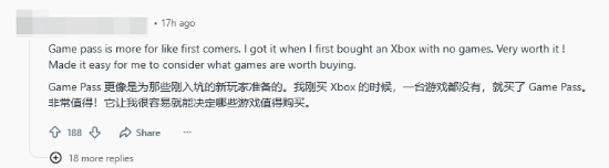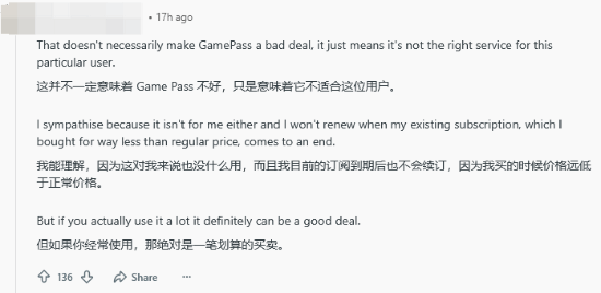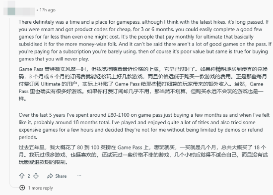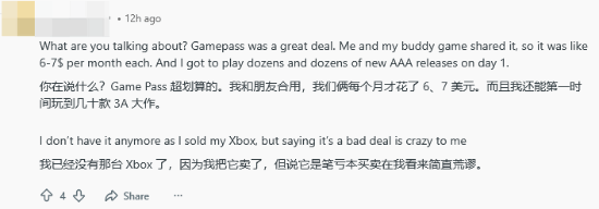 当然,也有玩家觉得问题根源在于发帖人自身——是他没能充分利用XGP丰富的游戏库,才会生出这种“亏大了”的感受。