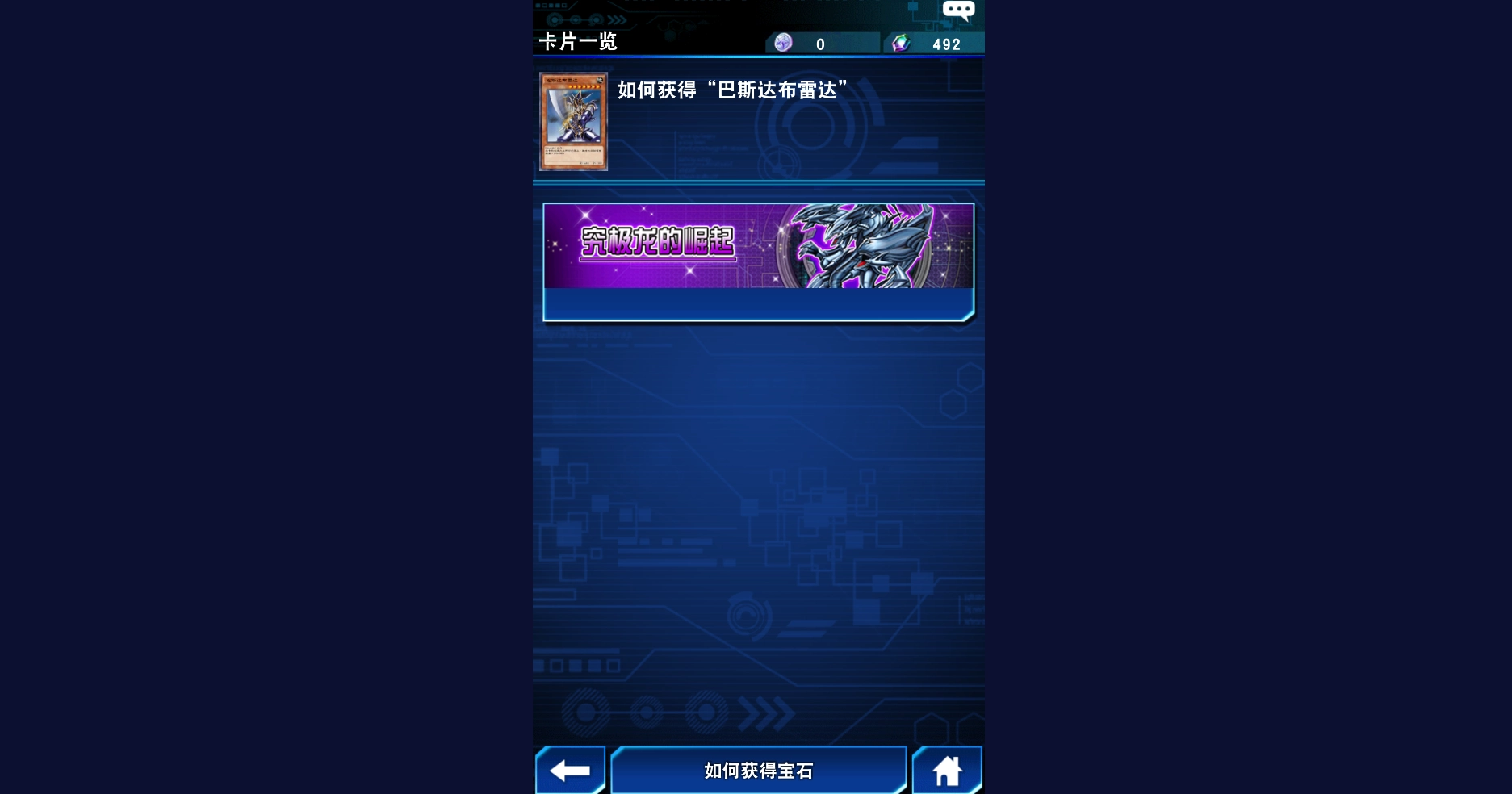 获取巴斯达布雷达的方法很简单,就是通过卡池抽取。商店里有个名为“究极龙的崛起”的卡盒,每个卡盒包含200个卡包,抽取这个卡盒时,有一定概率获得巴斯达布雷达这张卡牌。