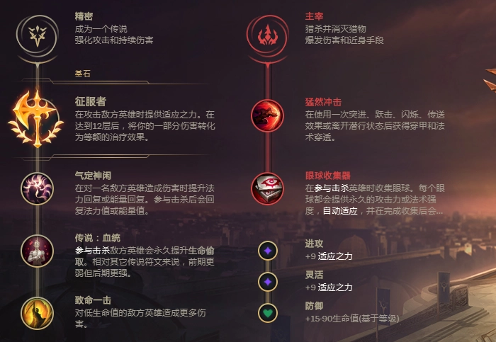 关于符文搭配,稻草人的玩法主要分为电刑与征服者两种思路,但考虑到新手的操作适配性,征服者会是更稳妥的选择。主系推荐点出征服者、气定神闲、血统和致命一击——其中血统的作用在于强化稻草人的生命偷取能力;副系则建议选择主宰系的猛然冲击与眼球收集者,这两个符文的组合能最大程度发挥稻草人的机制优势,堪称绝配。