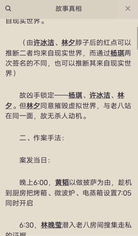 虽然不清楚老八确切的死亡时间,但能确定他的尸体尚未僵硬,加之老八来自现实世界,由此可推断杀害他的凶手同样来自现实世界。现实世界的相关人物有冰洁、林夕和杨琪。不过林夕与老八在摧毁虚拟世界这一观点上立场一致,因此林夕不存在杀害老八的动机。玩家只要逐步展开推理,就能找出杀死老八的凶手。