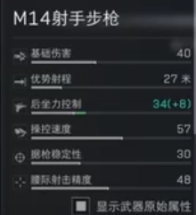 M14射手步枪的基础伤害是40点,和其他步枪比起来杀伤力属于中等水平。它的射程能到27米,因此玩家通常会在较近距离时用它发起攻击。而且它的腰射精准度有48,这使得它对敌人造成的有效伤害比较可观。另外,M14配备了不同规格的弹匣,常见容量有20发、30发和50发,玩家可以依据战场上敌人的数量,挑选合适载弹量的弹匣来装配。