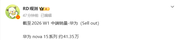1月12日,数码博主“RD观测”发布消息称,截至2026年第一周,华为nova 15系列手机的销量已达到41.35万台。