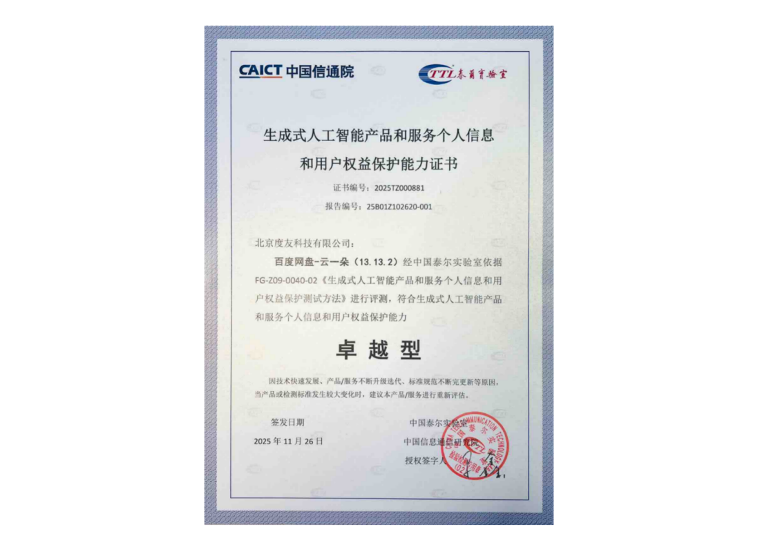 近日,百度网盘顺利通过中国信息通信研究院(以下简称“中国信通院”)开展的生成式人工智能产品与服务个人信息及用户权益保护能力评估,并荣获“卓越型”认证。作为该评估体系中的最高等级,“卓越型”认证充分表明百度网盘在生成式AI个人信息保护领域已处于行业领先地位。