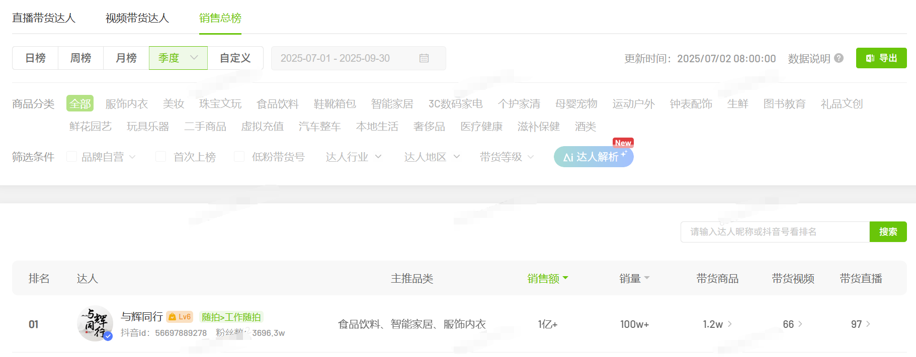 回看董宇辉这边,与辉同行做得真的很不错。小雷到飞瓜平台看了一下带货达人榜,与辉同行守住了日榜、周榜、月榜、季度榜第一,稳坐销冠之位。