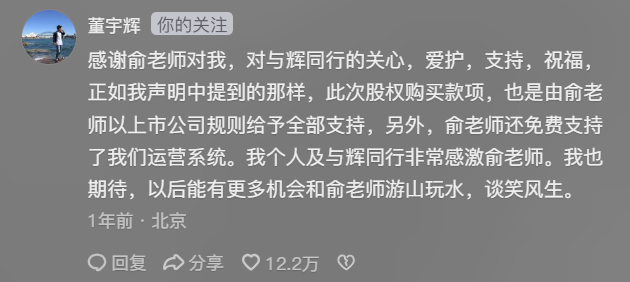 呐,小雷在俞敏洪的微信公众号找到了当时的公开信。他在评论区给大家说了大白话:宇辉买公司的钱我安排的(公司是送给宇辉的)、与辉同行的收益和利润全部留给了宇辉,东方甄选和我都没拿。