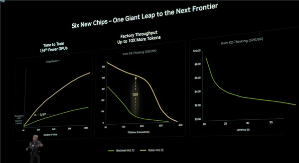 结果是,和上一代Blackwell平台相比,性能提升幅度达到5倍之高,而功耗仅增加1.6倍。这让Vera Rubin架构在整体上能在相同时间里训练大型“混合专家”(Mixture of Experts, MOE)AI模型,还可以把推理阶段的token成本最多降低10倍,同时将训练混合专家模型(MoE)需要的GPU数量减少到原来的四分之一。