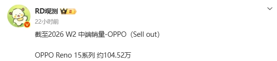 近日,有数码博主披露了OPPO Reno15系列的销量情况。根据爆料信息,到2026年第二周为止,该系列销量大概达到104.52万台,而第一周的累计销量是91.63万台。和前一周相比,这一周的销量超过了12万台。