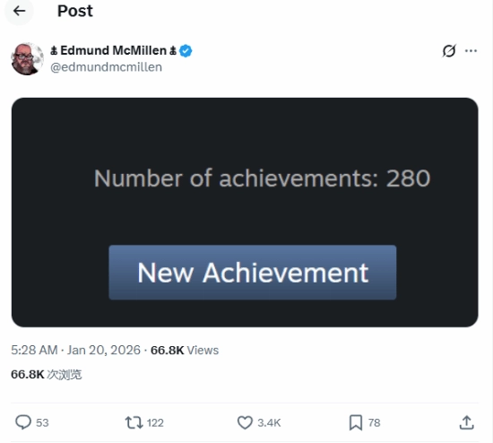 制作人Edmund最近在推特上公布了一个重磅消息:这款游戏在首发时就会带有280个Steam成就。