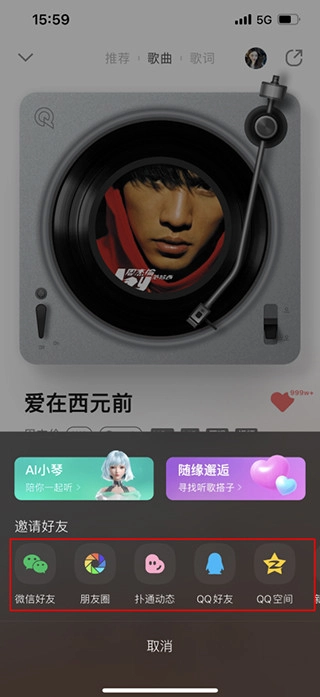 当弹出邀请好友的界面后,你会看到多种邀请方式,挑选一种自己偏好的方式发出邀请,等好友点击你分享的链接进入,就能和你一起听歌啦。