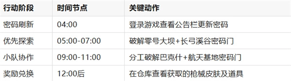 优先探索零号大坝(密码2763)与长弓溪谷(密码2130)这两张地图,其密码门奖励涵盖高价值枪械皮肤,例如SCAR-H限定款。