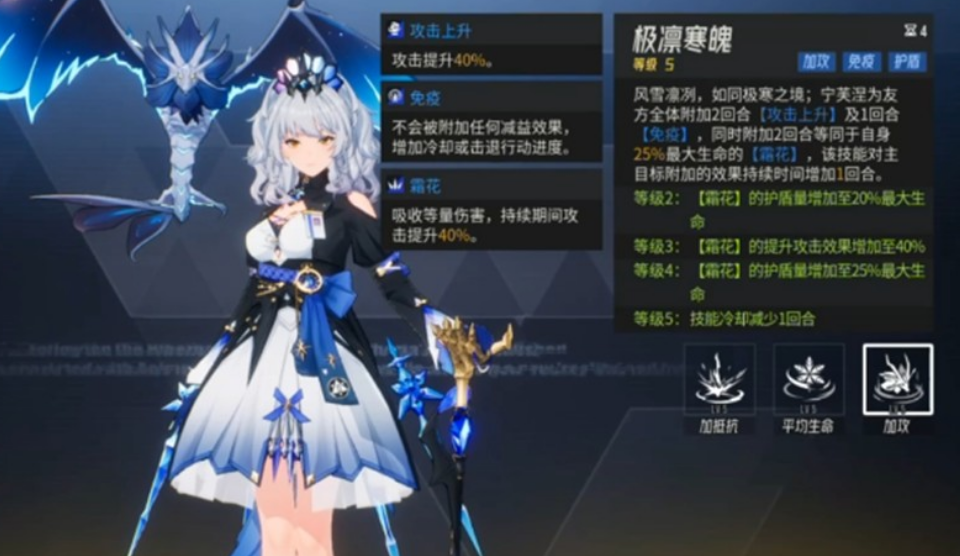 可以先将全队生命百分比拉平,再依据生命上限进行全体治疗。该技能适合血量分布不均的队伍,具有一定战略价值。若队伍已有稳定治疗手段,建议优先培养核心技能,以免资源浪费。极凛寒魄(核心技能)可提升全队攻击(持续2回合),并赋予一回合免疫控制效果;同时基于宁芙涅的最大生命值,为全队附加持续两回合的特殊护盾,还能使主目标的所有增益效果延长一回合。培养建议:作为核心辅助技能,应优先点满,能显著增强团队输出与生存能力,是关键战斗中的必备技能。