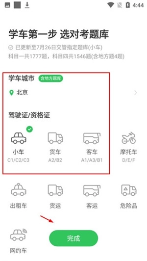 2、进入后,首先要选择好你所在的城市、报名的驾校,以及学习的A、B、C类驾驶证类型。
